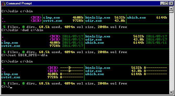 To specify a metadata item to display on the command line, use -d followed by the name of the item. To hide a metadata item that is included by default, use -h followed by the name of the item. To include an item by default, set SDIR_OPTS to include -d followed by the name of the item. For example, to display the file's written date on the command line, use "sdir -dwd". To display file attributes by default, use "set SDIR_OPTS=-dfa".